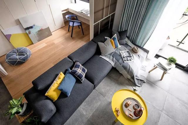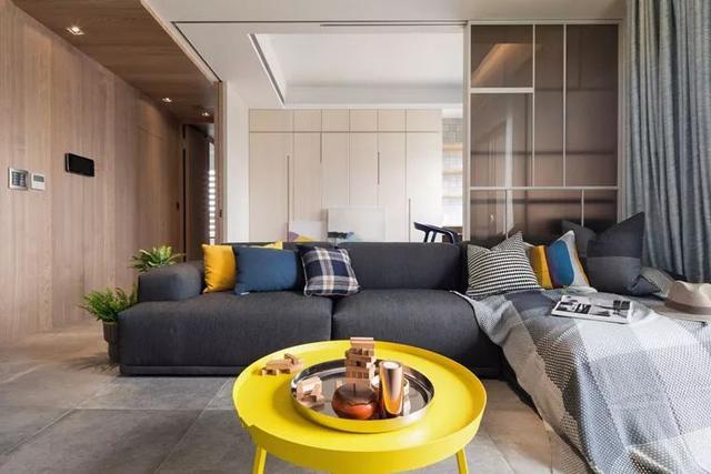 ▲黑色的布藝沙發(fā),成熟穩(wěn)重,黃色的抱枕點(diǎn)綴之上,雅趣也文藝。