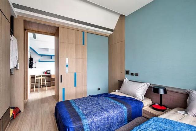 ▲兩張藍(lán)色的單人床,既給了兩個孩子獨(dú)立的休息空間,又讓其共用一個臥室,讓孩子學(xué)會相親相愛。