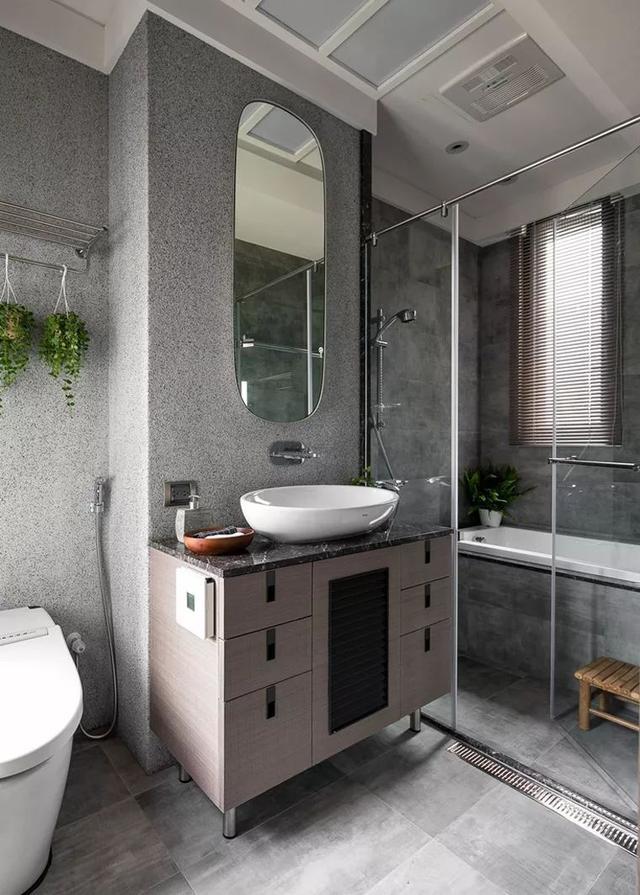 ▲玻璃門把干濕區(qū)相隔開,木質(zhì)的盆子,古色古香,浴缸旁的小木凳,方便小主人使用。