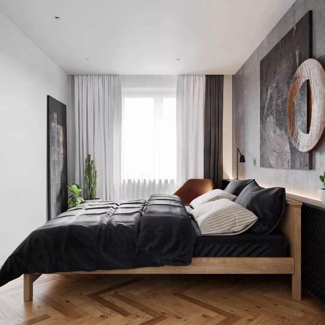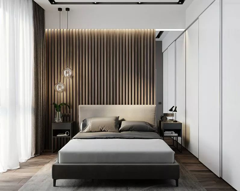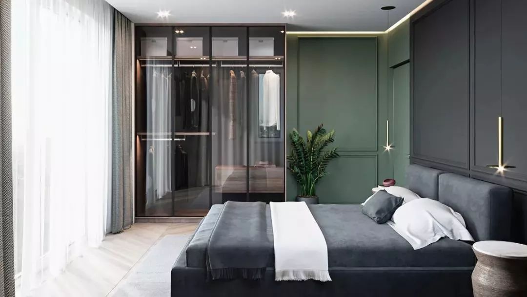 想讓臥室看起來(lái)比較大,可以用視覺(jué)延伸法,所以我們?cè)谘b修設(shè)計(jì)臥室的時(shí)候一定要拉伸空間的高度,比如說(shuō)同樣是衣柜,如果把它做到頂,不僅能讓空間看起來(lái)更立體寬敞,減少地面的占有空間,還能讓空間更具整體性,最重要的是能讓臥室的收納空間也大增。