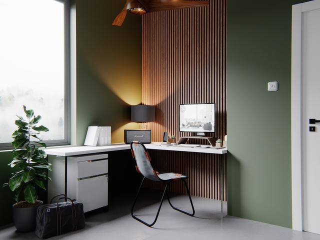 在工作空間內(nèi)使用木質(zhì)墻板。在一張白色的桌子后面,木條墻板使用了一個紋理背景,自然的色調(diào)與鼠尾草般的綠色房間裝飾完美地結合在一起。