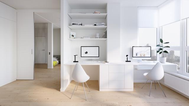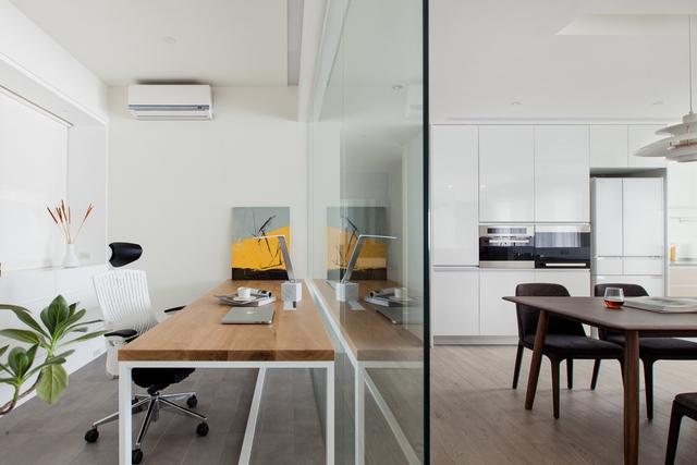 即使有噪音,也不會影響視覺效果。如果你不喜歡在家辦公時遠離家庭生活,那么玻璃隔斷怎么樣?屏蔽掉多余的噪音,甚至是烹飪的味道(如果這是你的工作領域的話),白色的主色調(diào),一個極簡主義的書桌和一個細長的led臺燈使工作氛圍變得簡單輕松。