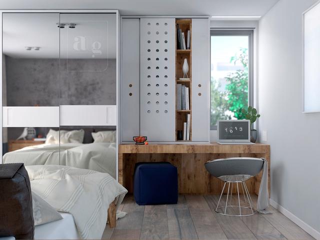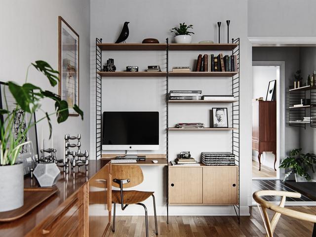 預留調(diào)整空間。這個斯堪的納維亞式的工作空間由一個可調(diào)節(jié)的架子和存儲單元構成。