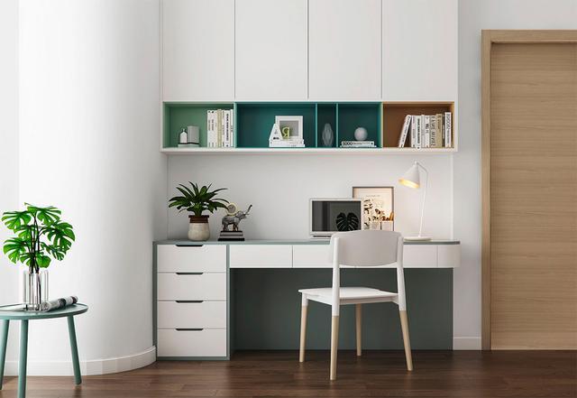 用舒適的顏色裝飾一個極簡主義的家庭辦公室。如果你喜歡一間全白的家庭辦公室的干凈外觀,但你的生活也需要一點色彩,那就在櫥柜里添置一些色彩鮮艷的植物吧。