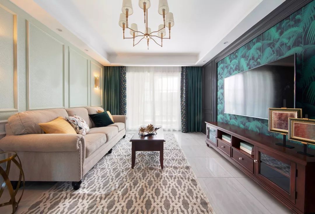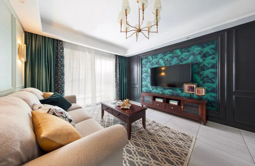 ▲ 黑色的護(hù)墻板造型墻與深綠色的壁紙碰撞,讓電視背景變得多樣化又具有個(gè)性。
