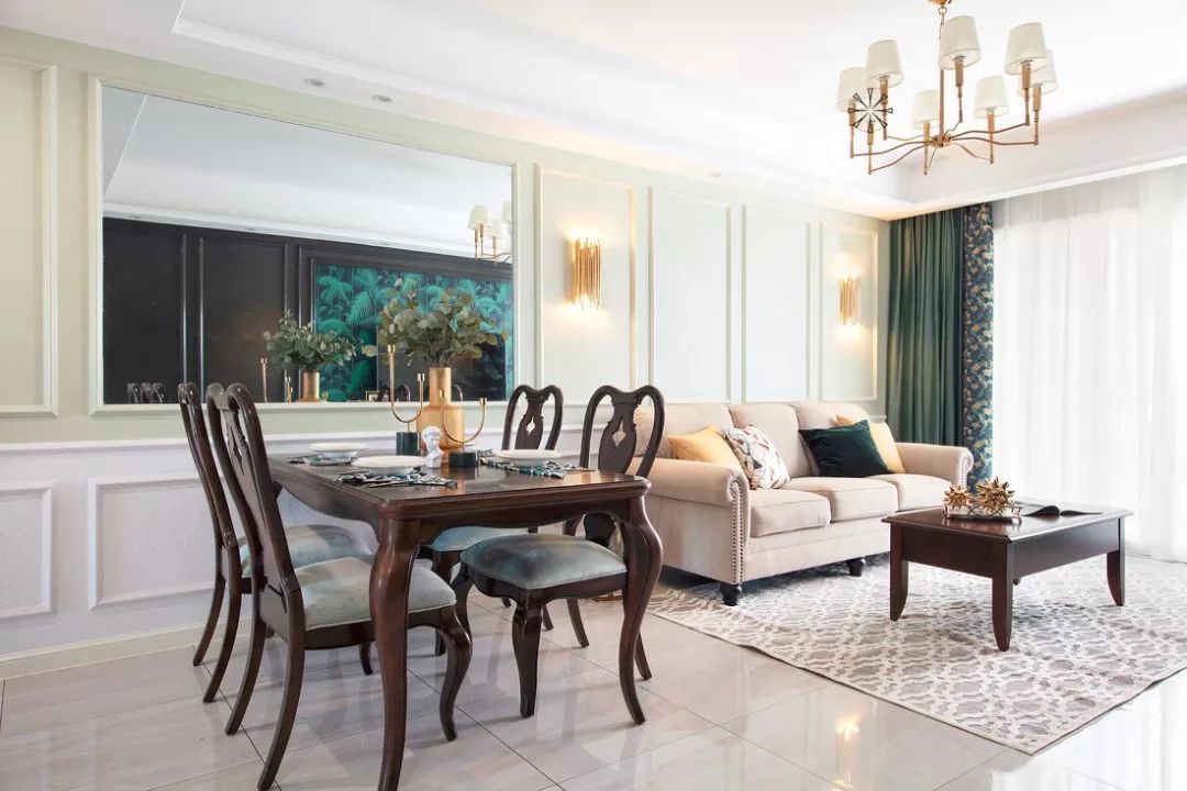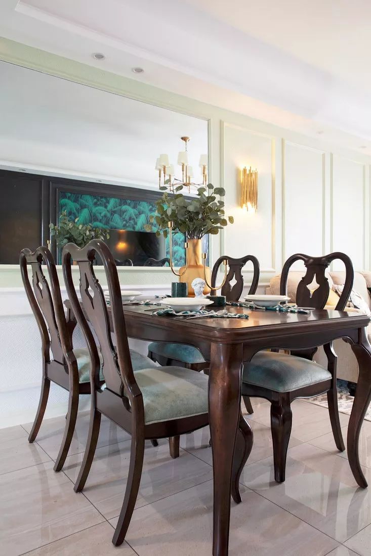 ▲ 餐廳墻面采用了可以擴(kuò)大視覺的鏡面設(shè)計(jì),空間在鏡面的映襯下美感加倍。深色實(shí)木餐桌椅沉穩(wěn)而舒適,精致考究的裝飾擺件提升格調(diào)。