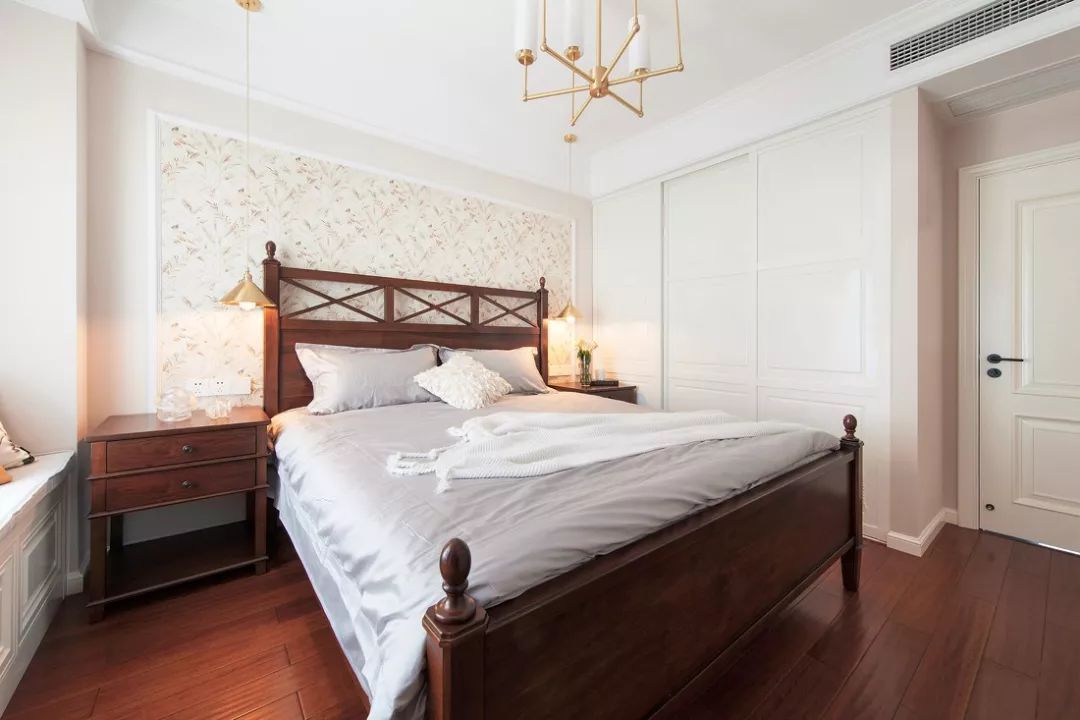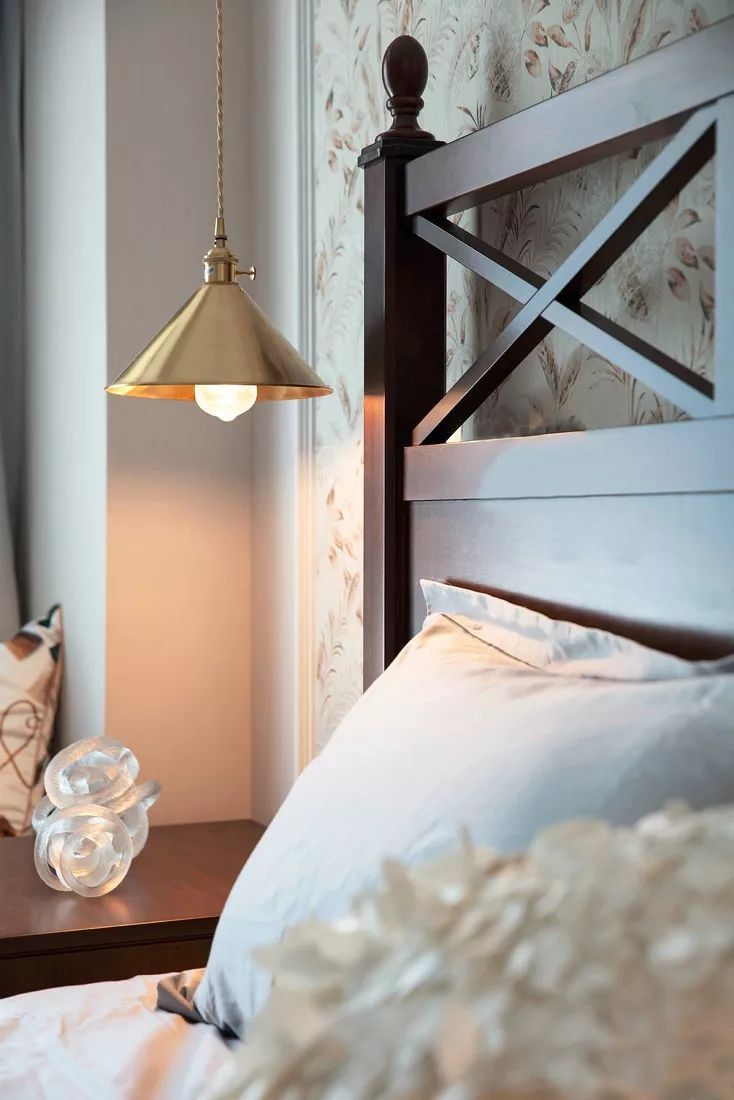 ▲ 金色的經(jīng)典款吊燈,凸顯出美式的精致質(zhì)感。柔和的燈光,營造溫馨滿滿的睡眠氛圍。