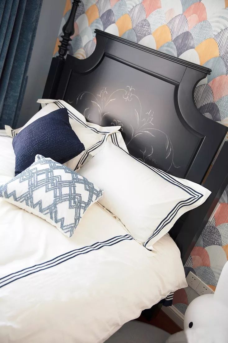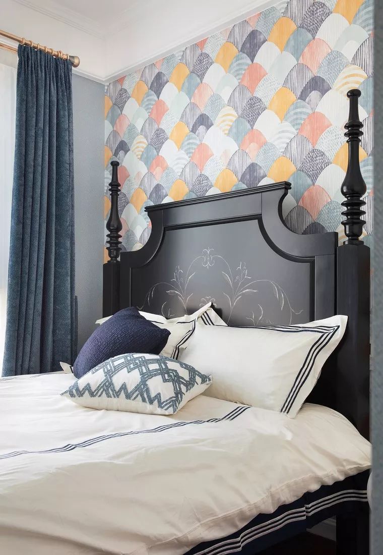 ▲ 兒童房,標(biāo)準(zhǔn)美式風(fēng)格的床讓整個(gè)空間顯得很硬朗,很有張力,搭配上床頭背景的彩色貝殼壁紙,可愛又俏皮。