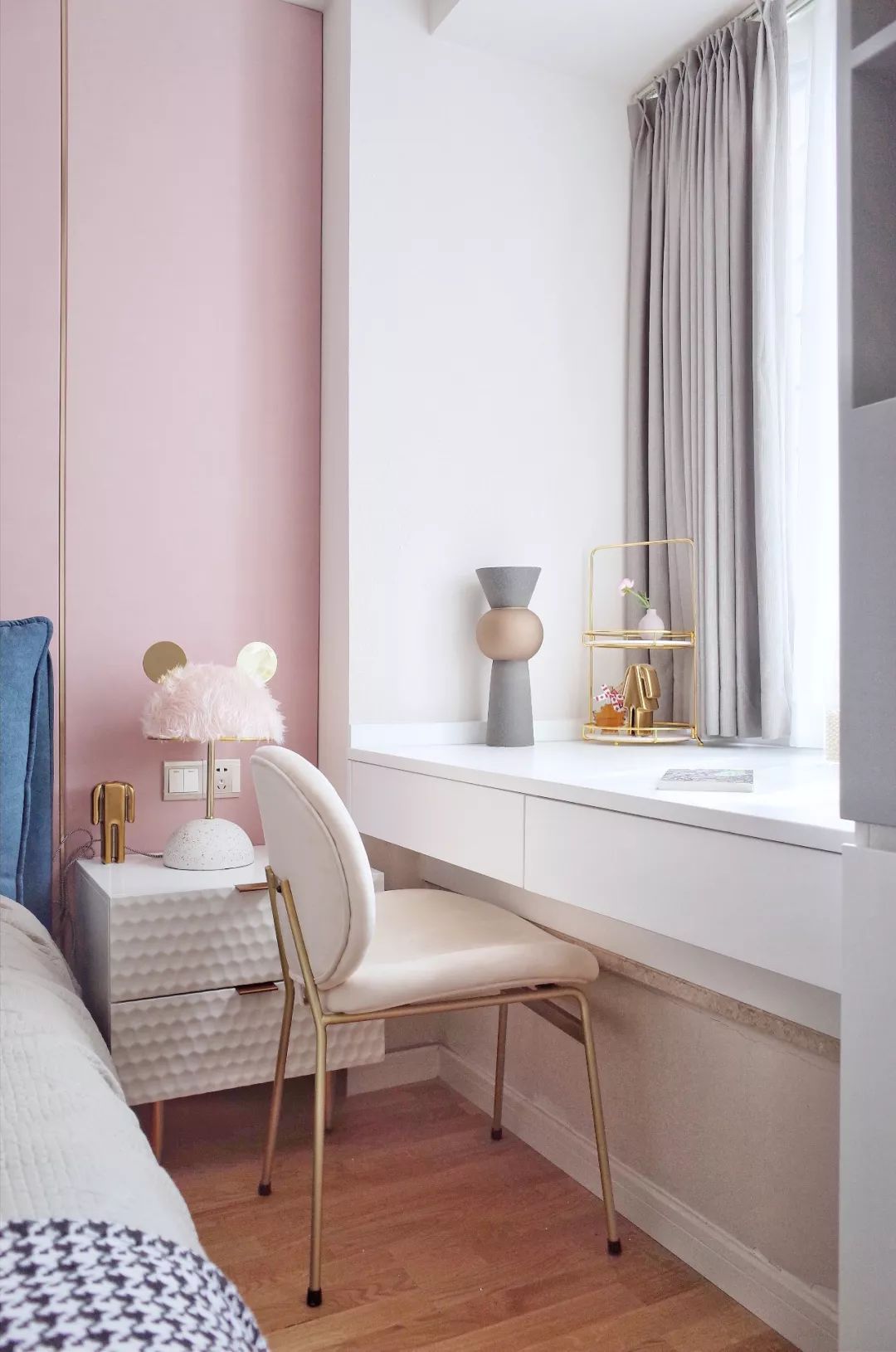 ▲ 主臥以珊瑚粉色的硬包作為床頭背景墻,唯美別致的軟裝布置,營造出浪漫優(yōu)雅的氛圍感。