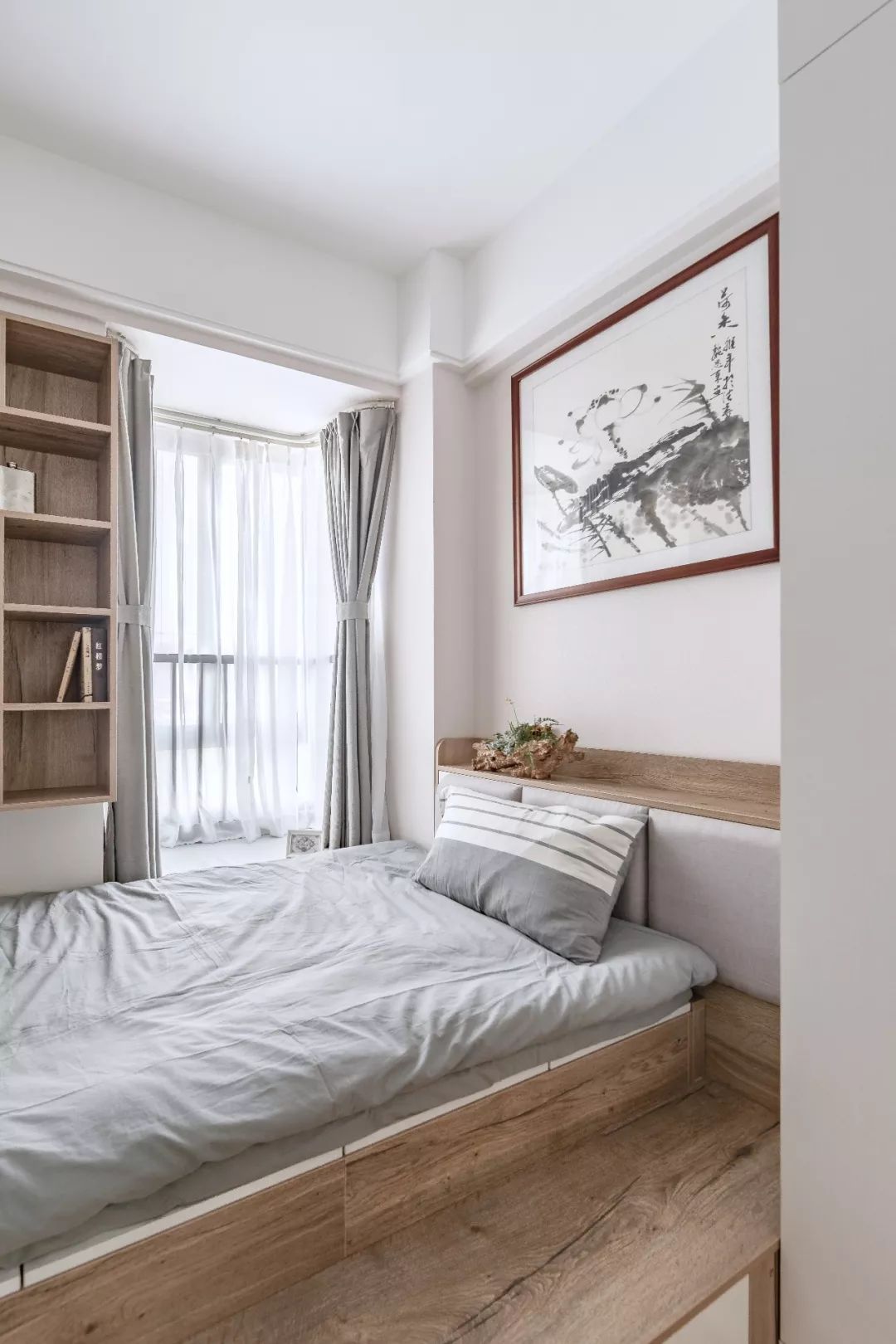▲ 采用定制榻榻米式的設(shè)計(jì),床頭區(qū)域代替床頭柜的收納功能,同時(shí)柜板做成軟包,增加舒適性。床頭背景墻以一幅水墨畫作裝飾,雅韻十足。