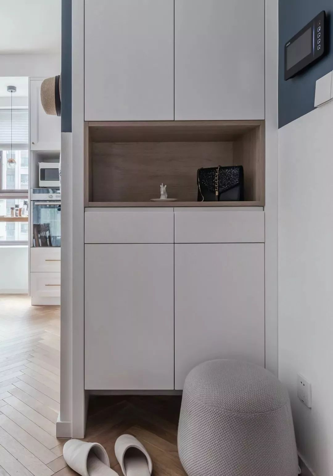 ▲ 玄關(guān)右側(cè)設(shè)計一組鞋柜,中部留空輔以原木框修飾,便于隨手置物,也能收納出行需要的小物件,底部留空延伸地面,放置常換鞋