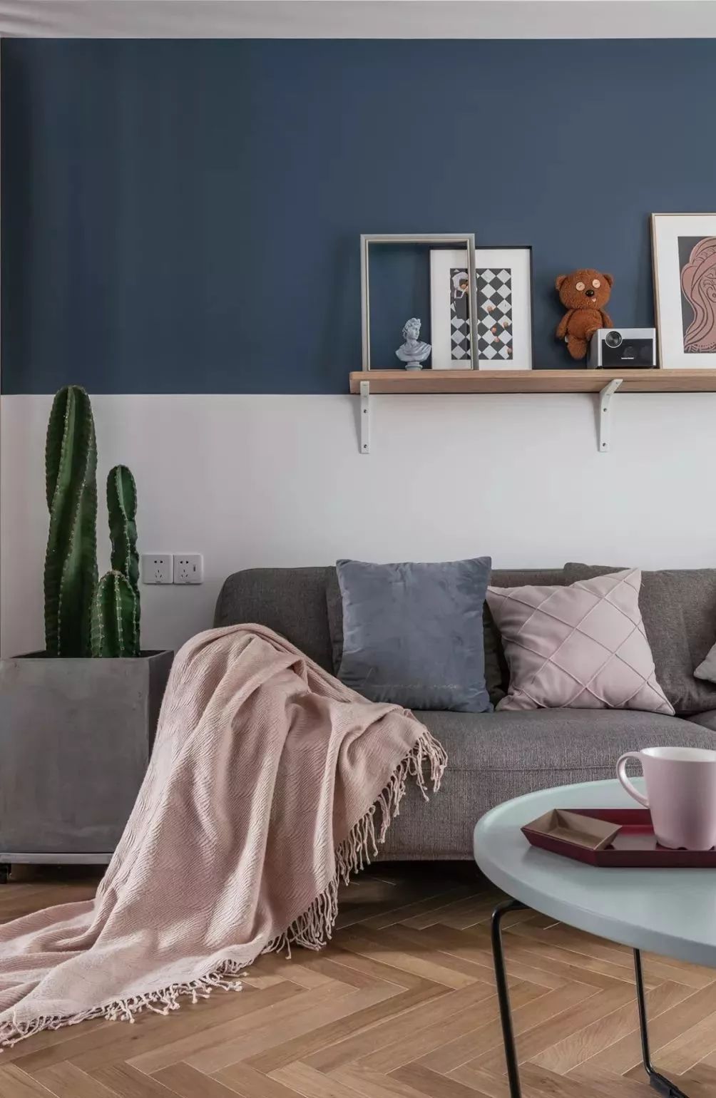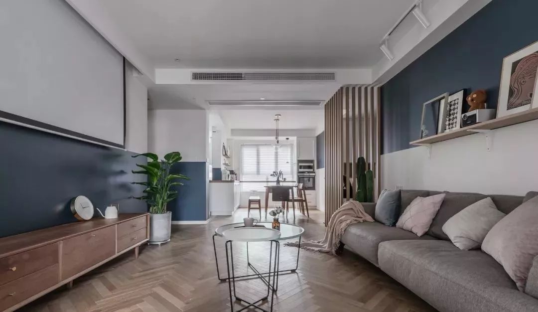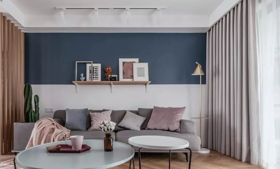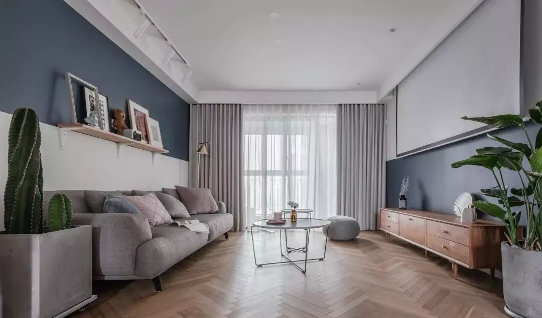▲ 灰藍(lán)+白的拼色背景墻通過木質(zhì)層板與裝飾畫以及擺件來修飾,水泥盆量天尺增加北歐清新元素