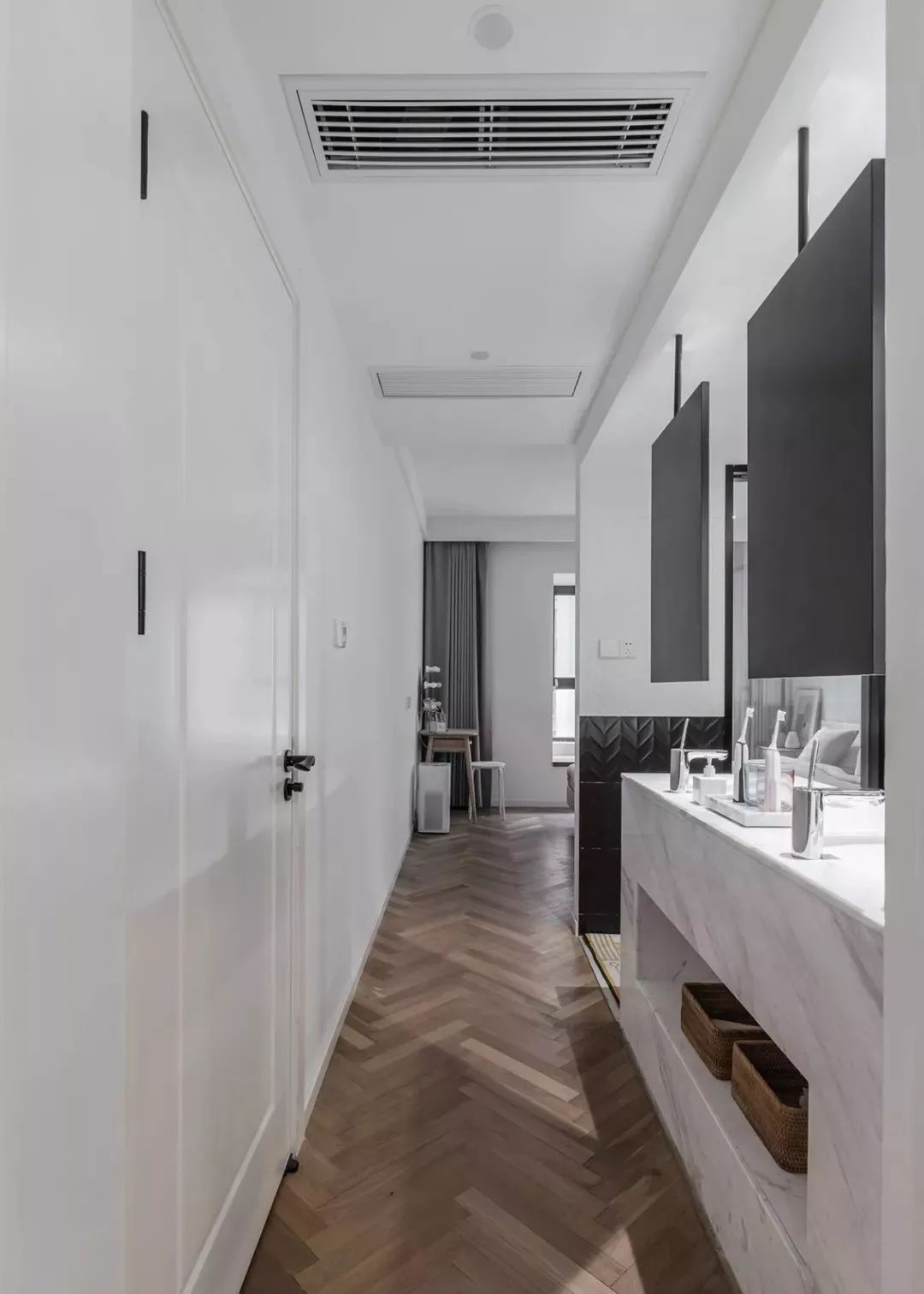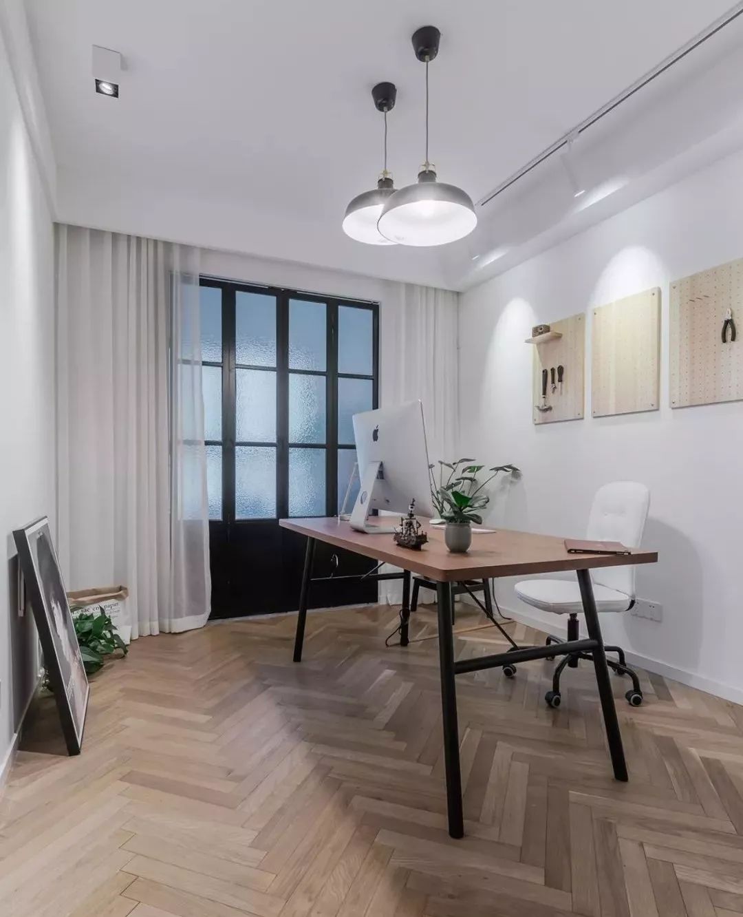 ▲ 書房延續(xù)人字鋪地板與簡潔的頂面,留白墻面用洞洞板裝飾,又具收納功能