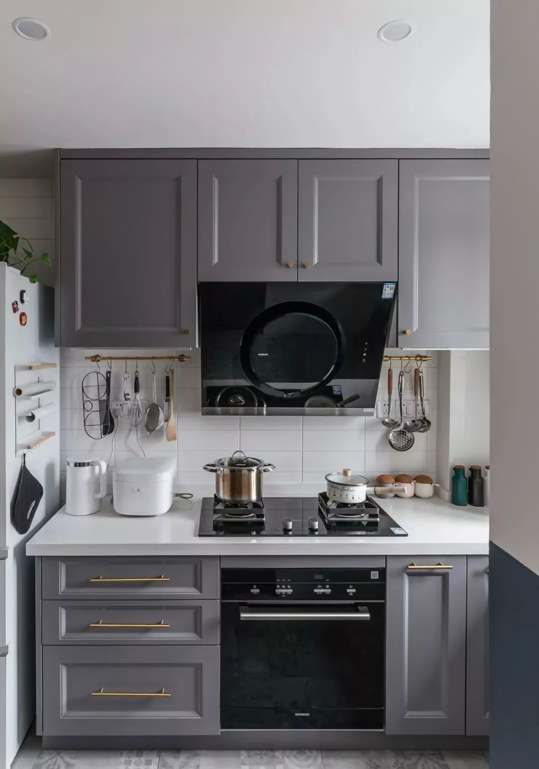 ▲ 廚房,灰色花磚搭配灰色櫥柜門,金色拉手與墻面的金色掛桿呼應(yīng)