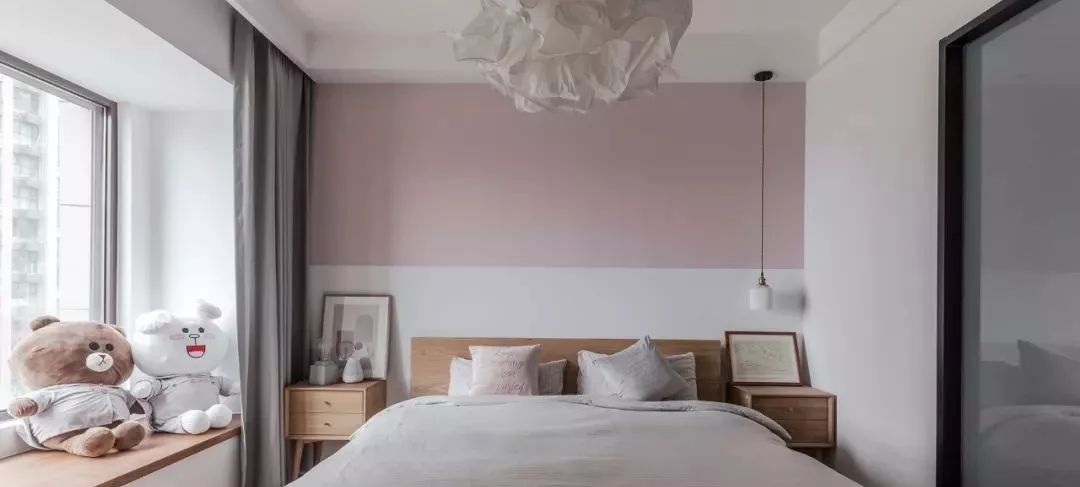 ▲ 原木家具搭配粉白拼色背景,造型主燈與床頭的線性吊燈負(fù)責(zé)營造臥室氛圍,大飄窗提供臥室充足采光與開闊視野