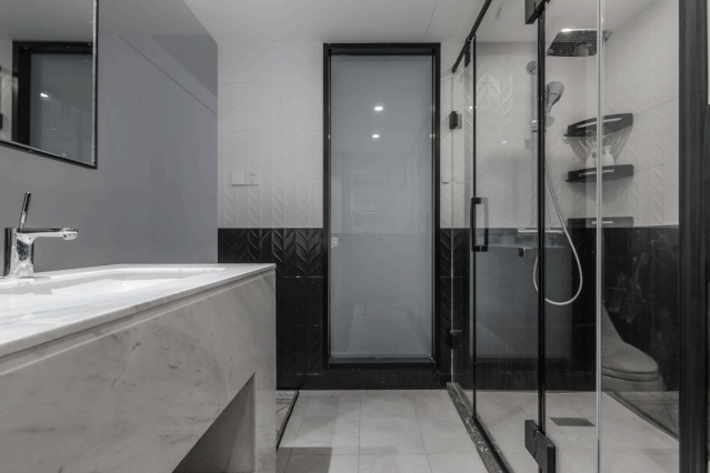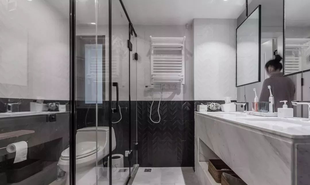 ▲ 主衛(wèi)延續(xù)拼色風(fēng)格,在墻面鋪貼肌理感黑白磚,雙臺盆+雙掛鏡設(shè)計提高使用效率