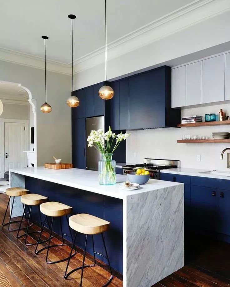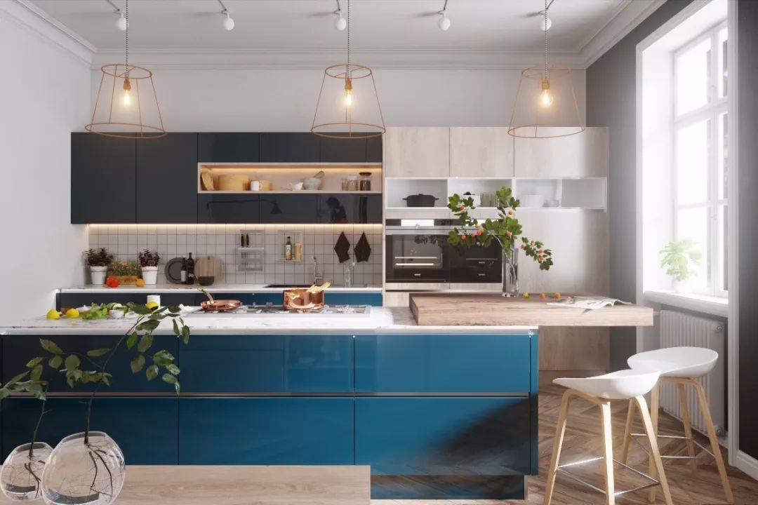 藍色廚房兼具優(yōu)雅和高冷范兒,它本身的氣質比較清新,再加上金屬吊燈、大理石元素以及綠植作為裝飾,更能打造出一個令人心動的治愈系廚房,讓平日日“十指不沾陽春水”的男士,也會忍不住愛上。