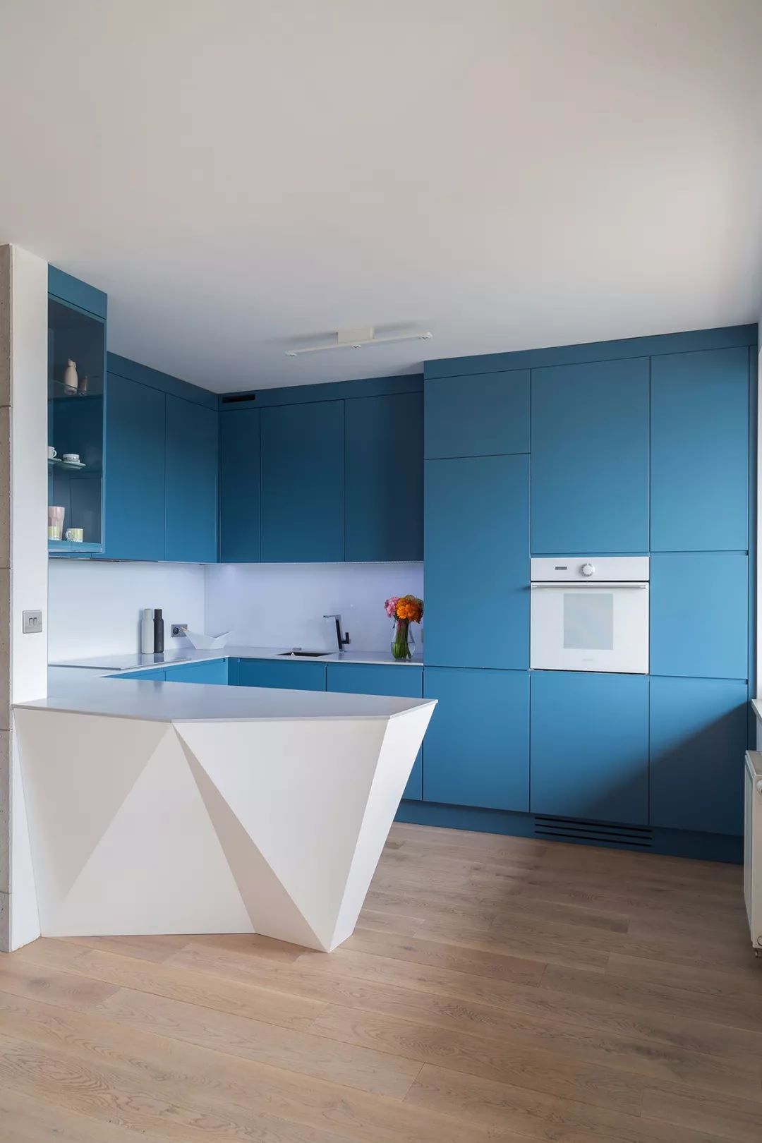 藍色與白色的搭配,也深得時尚人士恩寵。因為它質感舒適而清涼,是一種能夠讓人沉靜下來的顏色,與純白色組合運用到廚房之中,更是將簡約進行到底,凸顯出一種海洋色的調性,看起來活力十足。