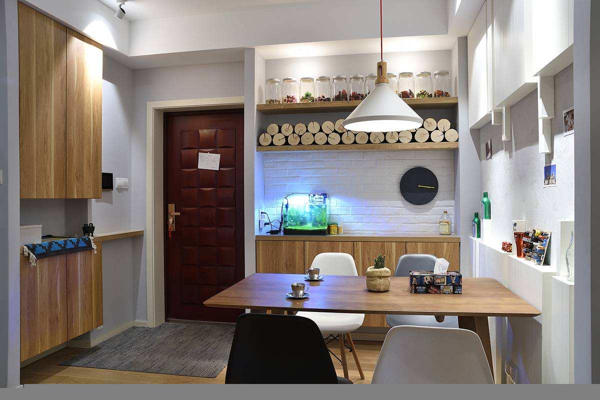 餐桌椅等家具的款式要從簡出發(fā),以保證空間的整潔,才不至于顯得凌亂。同時,對于墻壁空間的設(shè)計也是不容忽視,簡單的布置些擱架供洋酒的擺放洋酒,或是用來掛放衣物也都非常的不錯,為日常生活提供很大的便利。