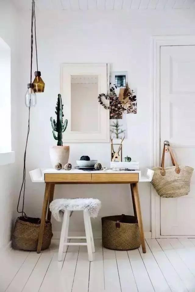 除了玄關(guān)鞋柜的擺設(shè)之外,在這種原本沒(méi)有玄關(guān)的戶型中,增加一面玄關(guān)鏡,搭配上墻面裝飾,一張梳妝臺(tái),貼墻擺放不占空間的同時(shí),不會(huì)有進(jìn)門(mén)見(jiàn)廳的尷尬。