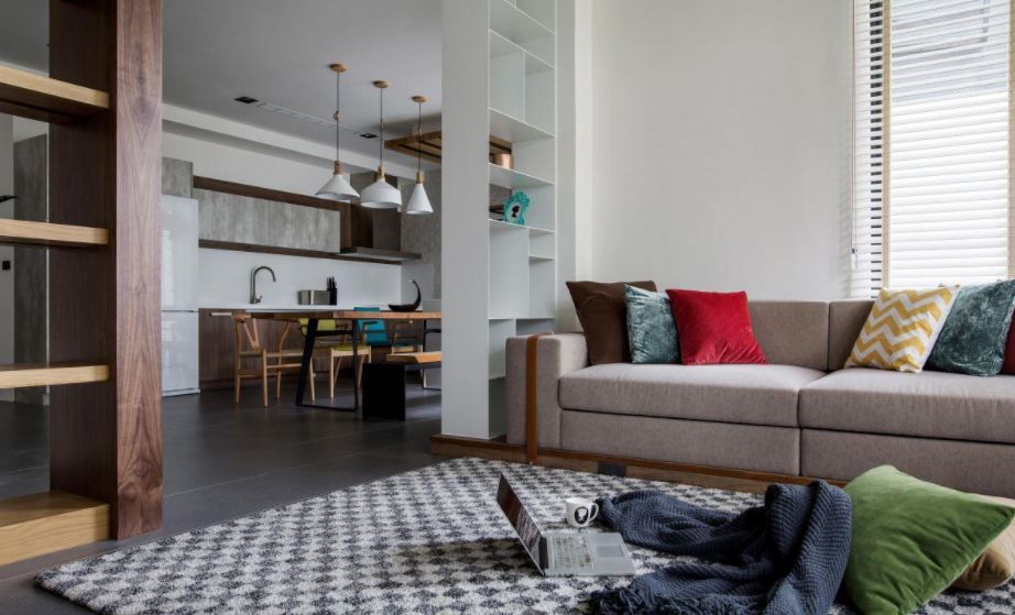 客廳與臥房運用相同的胡桃木鋪排,深淺跳色以及木頭紋理,讓居家溫暖、自在調(diào)性冉冉而升,并利用地坪材質(zhì)的拼接,劃分出玄關(guān)及客廳場域。