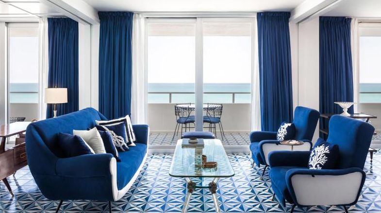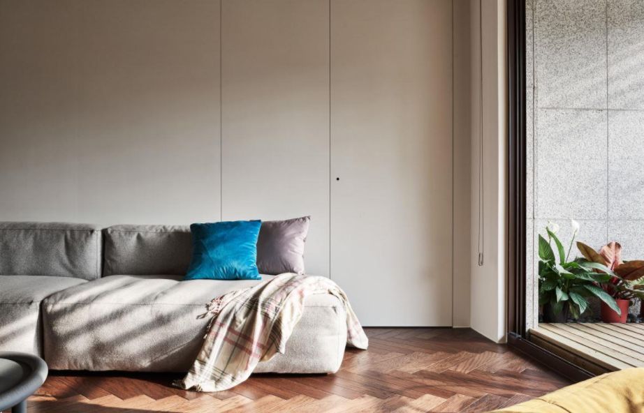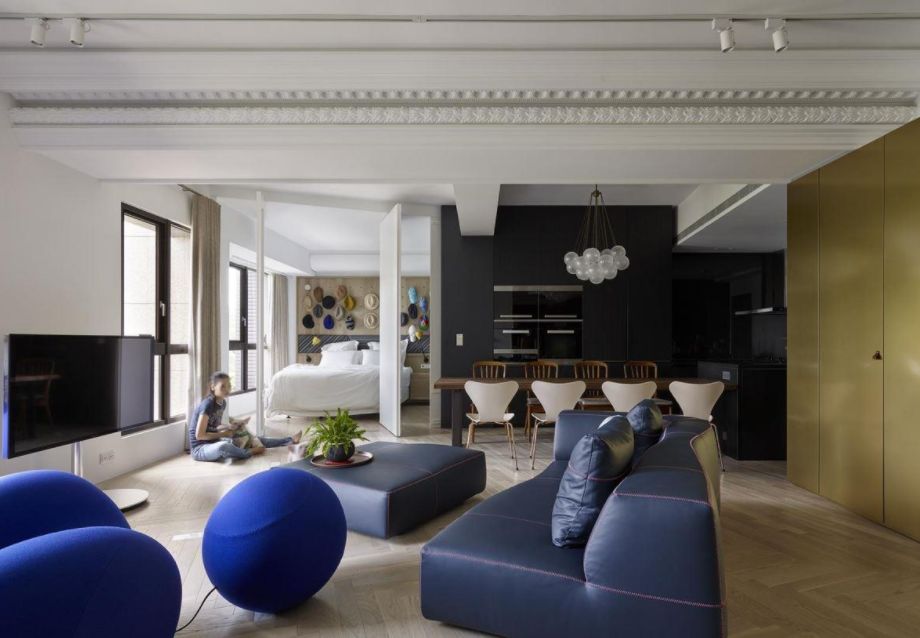 人字木紋與寶藍(lán)色主人椅相互搭配,讓動線延伸至活動式墻面,視覺、生活動線順暢并相互串聯(lián)。而地板局部角落鑲上異質(zhì)材,拼搭出不一樣的精致表情。
