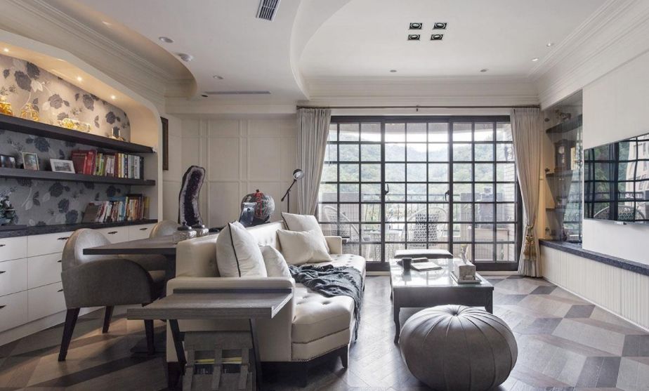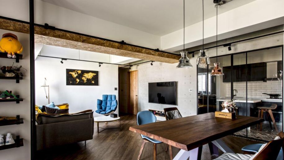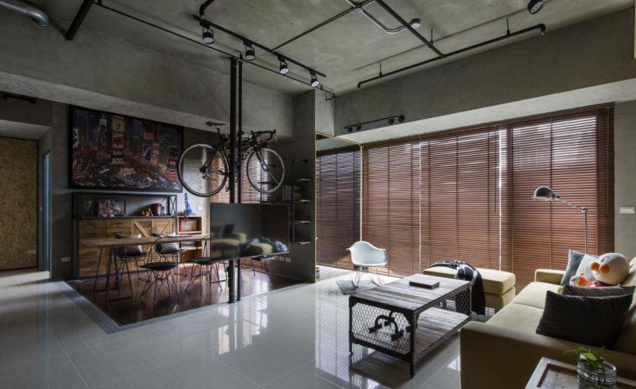 如要選用深色系地坪,先考慮居家采光度及壁面色彩,這間百坪大宅以深灰色地坪作為空間色彩的基底,讓鐵件、木紋元素,相互混搭型塑帶有沉穩(wěn)質(zhì)感的文青風(fēng)。
