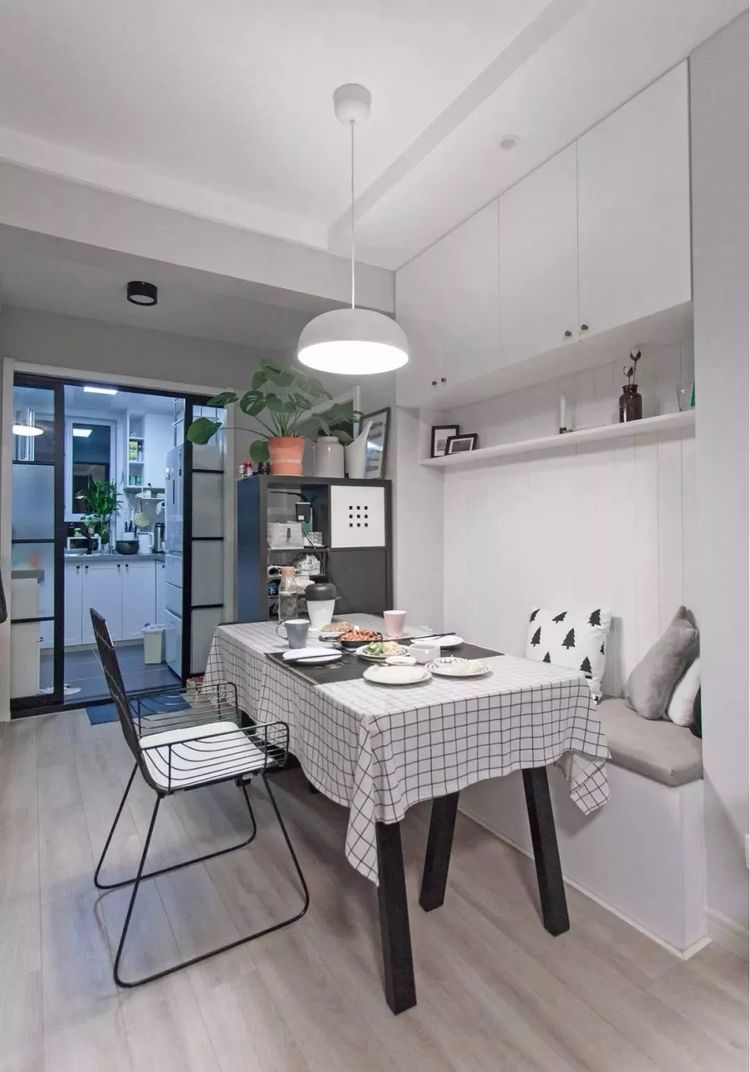一般常規(guī)的餐椅,靠背會有5-10cm的尺寸,這對于面積原本就較小的餐廳來說實在是太奢侈了,為了讓空間得以最大化的利用,用卡座來替代這個餐椅的話,就能完全貼緊墻面安裝座椅,而且卡座下方還能裝成收納柜,這樣省空間又能收納的設(shè)計,可謂是一舉兩得的奇思妙想。