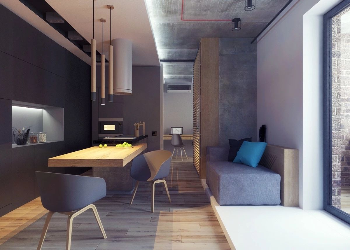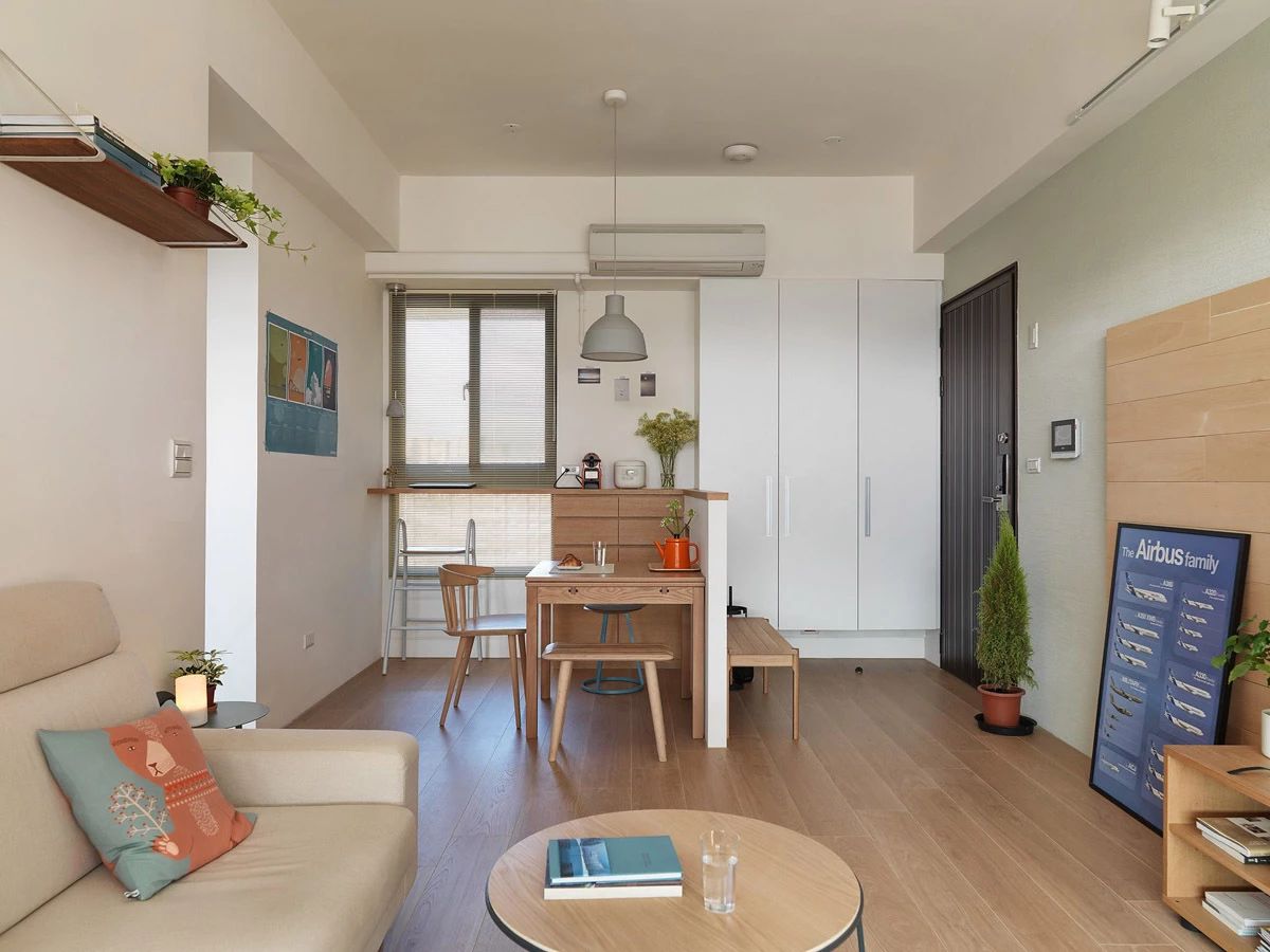餐廳和客廳都在同一個空間,餐廳就適合設計在靠著墻面的角落,擺放一個餐邊柜和小餐桌,且客廳和餐廳之間不加隔斷。