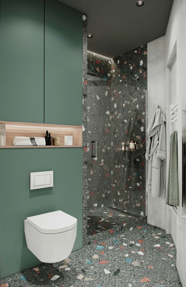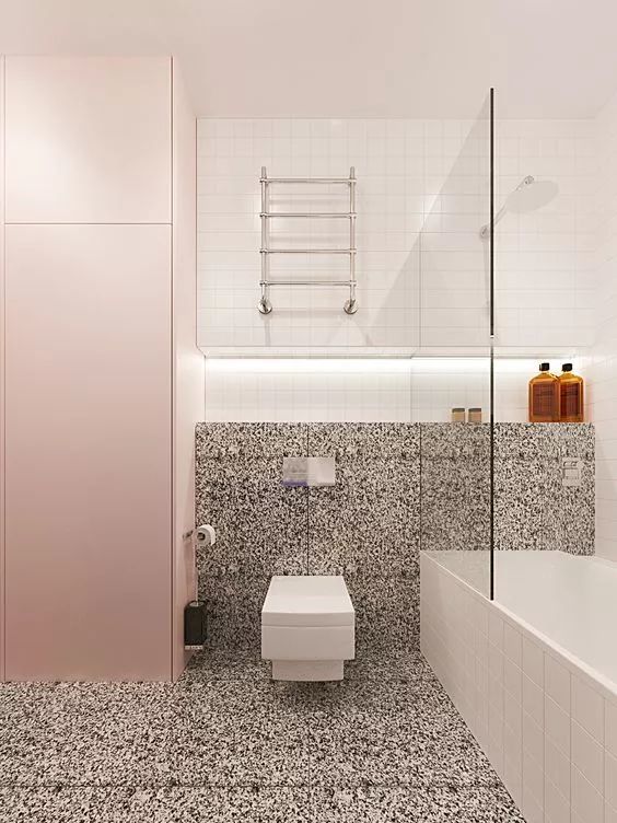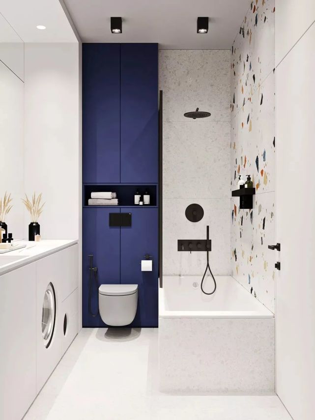 壁掛式馬桶在安裝的時候,需要在馬桶后方砌墻,這樣在馬桶后方就會多出一個擺臺,這個位置可以存放紙巾、馬桶清潔劑等物品,也可以把上面利用起來做成多層收納壁龕,超級實用哦。
