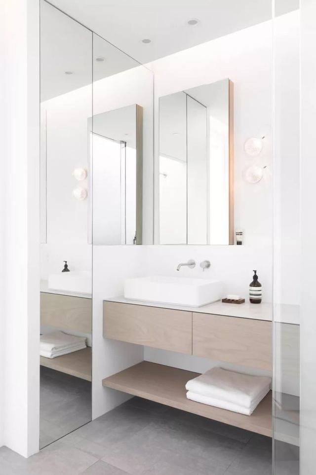 鏡子除了延伸空間,還能隱藏空間。將鏡子應用到柜門上,在鏡子背后隱藏若干置物格,分類整理洗漱用品和護膚品,既能通過鏡面的反射給衛(wèi)生間帶來延展視覺,還可以很好地利用盥洗臺上方的空間,就算偶爾雜亂,關上“門”眼前就立刻干干凈凈。