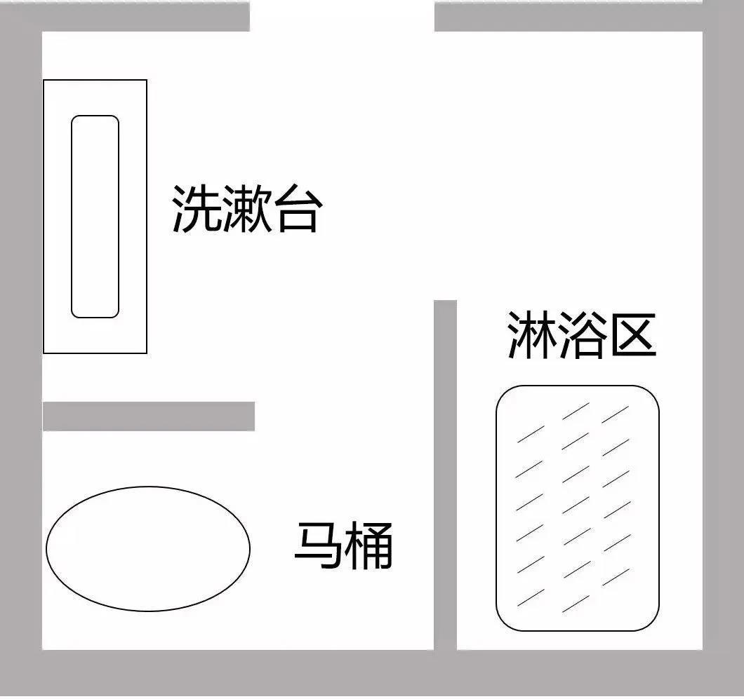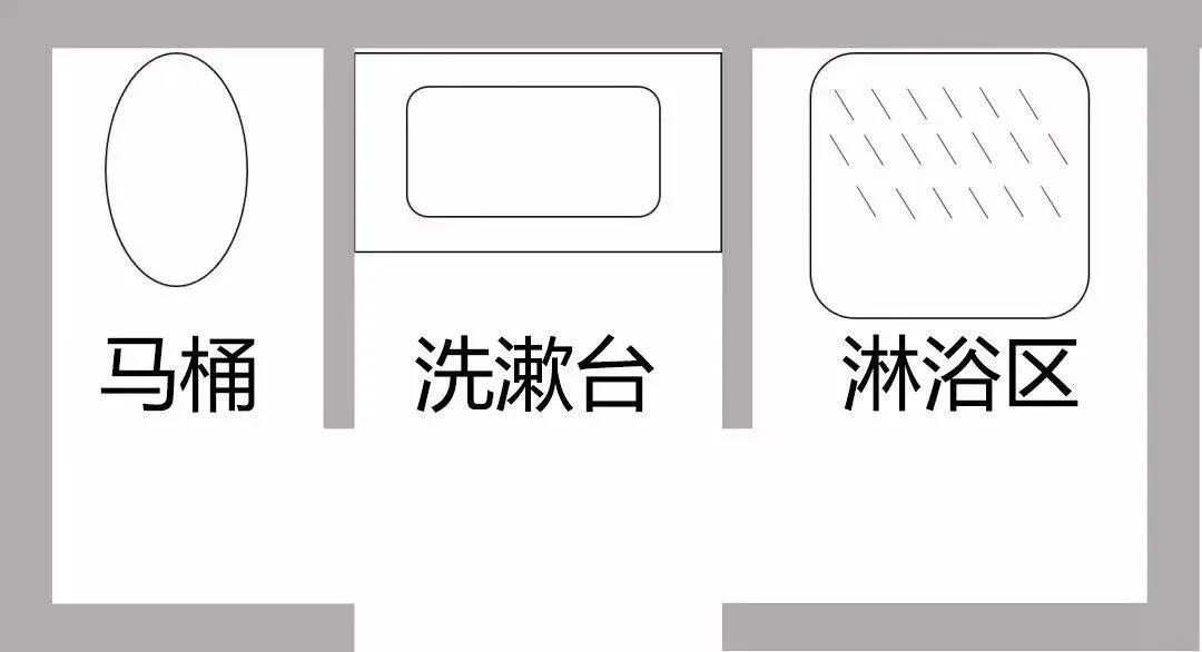根據(jù)衛(wèi)生間原始結(jié)構(gòu),將淋浴區(qū)、洗漱區(qū)、馬桶區(qū)三個(gè)區(qū)域并列排放,洗漱區(qū)使用頻率高,且不像淋浴區(qū)和馬桶區(qū)隱秘性高,所以可以放在靠近門(mén)口的位置。