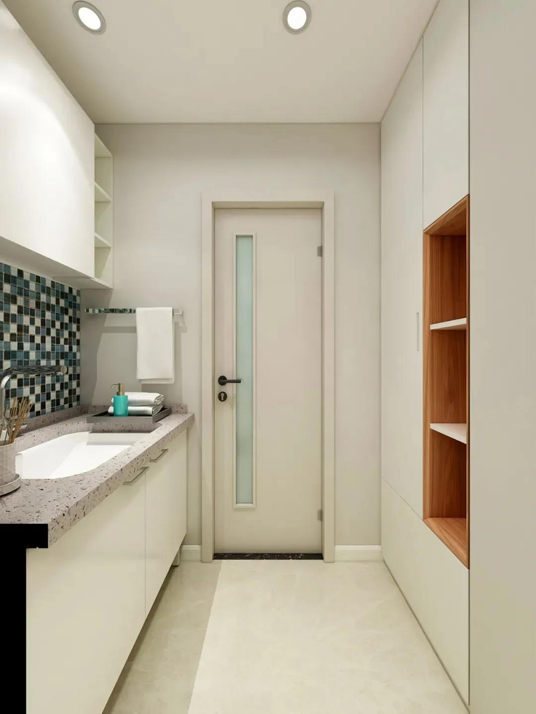 將洗漱區(qū)外移至過(guò)道處,騰出的空間讓淋浴區(qū)和馬桶區(qū)更加寬敞,還可以做個(gè)分離。