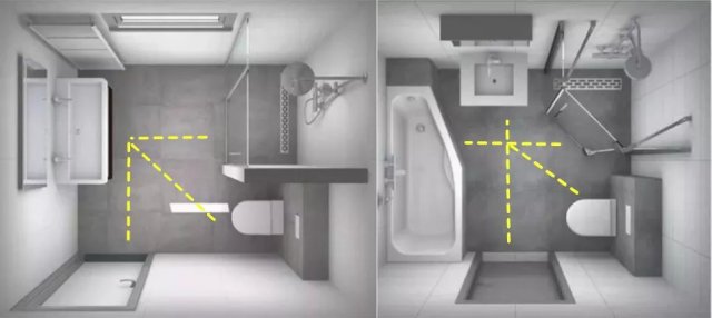 方形浴室貌美,幾乎隱形;而寶石形浴室需要固定配件,但從日常實用角度看實際方便很多,特別是馬桶擠在小角落的時候。