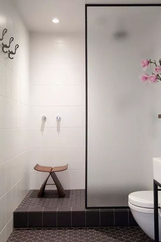 打開門,淋浴區(qū)和馬桶(或洗手臺)在同一側(cè),簡單做個平板玻璃隔斷,簡單直白。