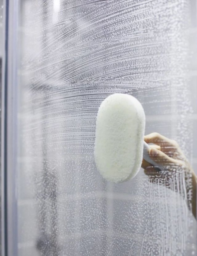可以買一瓶弱酸性的擦玻璃清潔劑,把清潔劑噴在海綿擦上。(想省力就不要聽土方用醋和鹽DIY,專業(yè)清潔劑比土方好用100倍)