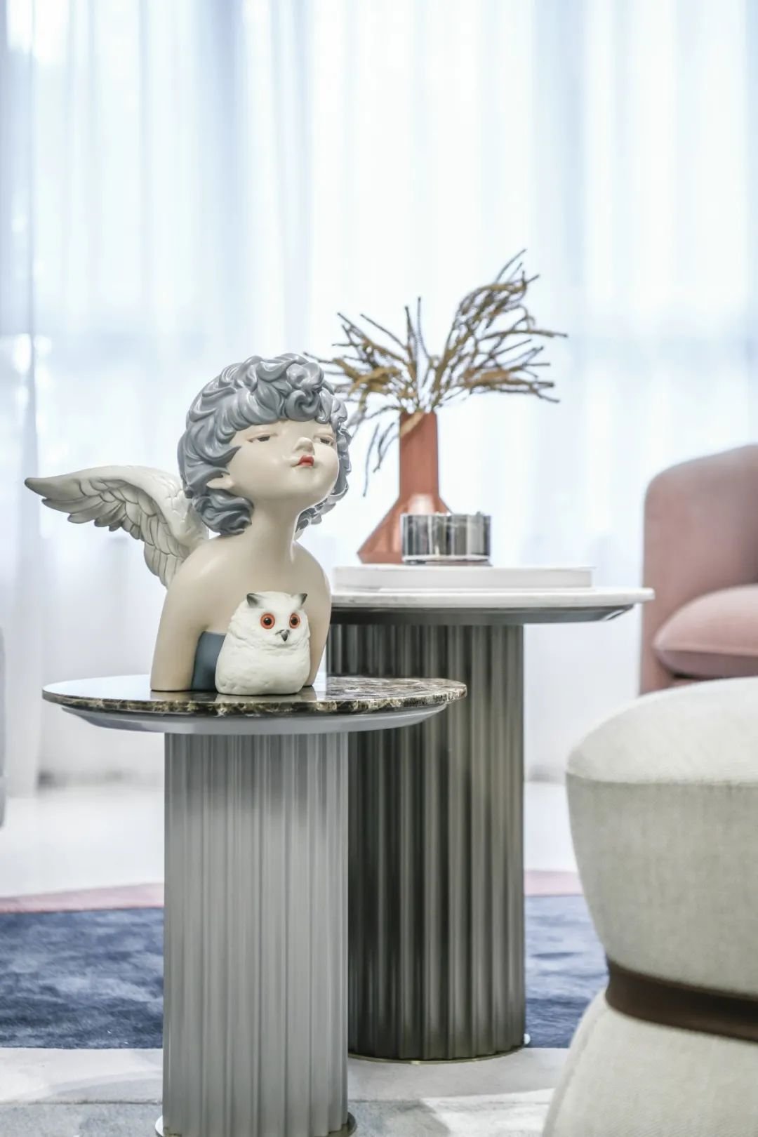 擠空間不如騰空間,注意沙發(fā)、茶幾的尺寸選擇和擺放,保證安全、活動(dòng)空間足。小沙發(fā)+小圓幾,分分鐘把大家具的占用的空間騰出來,還不用怕孩子爬來爬去。沙發(fā)茶幾呈圍坐式擺放,分散孩子對電視的執(zhí)著,待客也能輕松搞定。