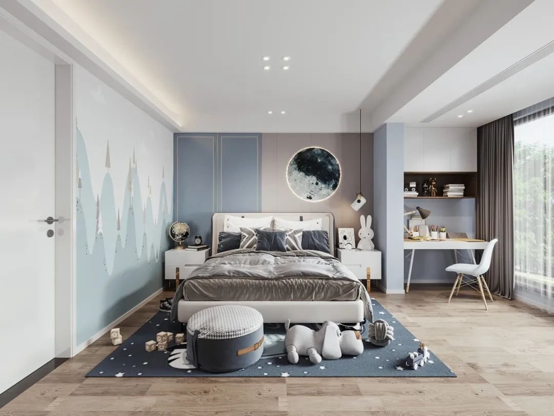 臥室一定是跟著孩子一起成長的空間,睡覺+收納+學(xué)習(xí),從小住到大。一整面靠墻柜,圖書角+學(xué)習(xí)桌+衣柜組合設(shè)計(jì),一次性滿足學(xué)習(xí)+收納兩大需求?;蚶棉D(zhuǎn)角空間,從衣柜延伸出一張學(xué)習(xí)桌。床底也不放過,做收納型床。注意:別過分擁擠,床品、柜子等家具盡量靠墻,留出足夠空間給孩子自由活動(dòng)。