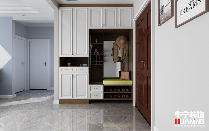 將衣柜、收納、鞋柜融為一體,多功能的收納區(qū)間,適合家庭成員多的家庭。