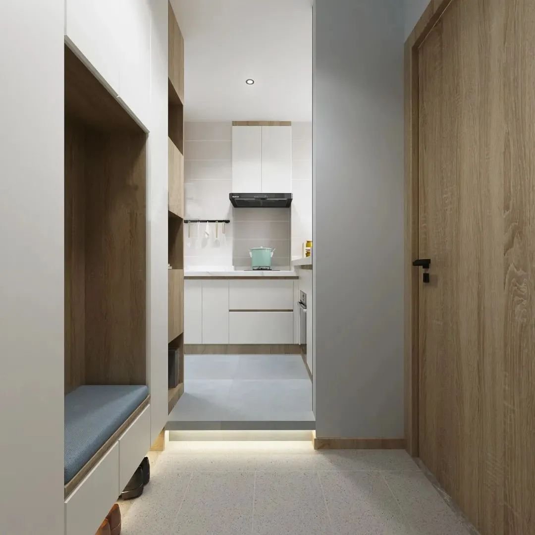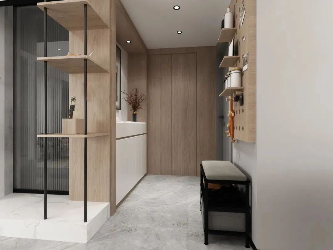 門廳和門廳之間,有一個隔斷可以增加空間的私密性,用鞋柜可以增加實(shí)用性,用屏風(fēng)可以增加私密性又能保證采光,更好的做法是鞋柜+屏風(fēng)的結(jié)合,對空間更有幫助。