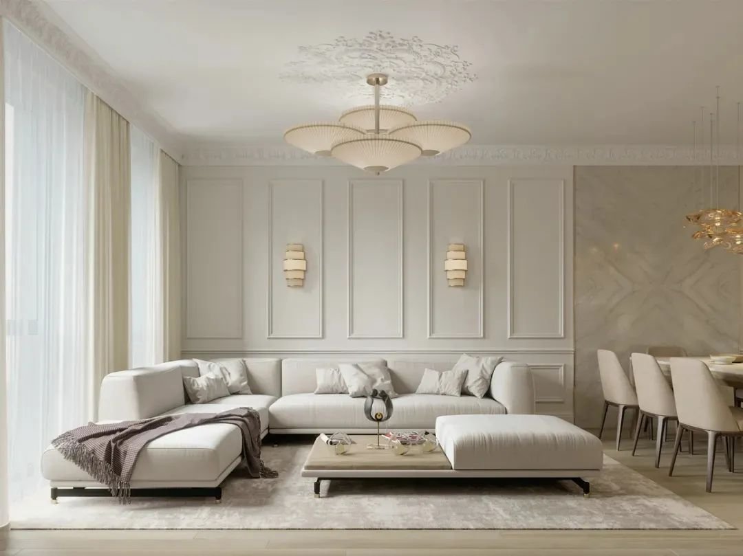 而線條簡潔、利落的石膏線,就沒有這方面的顧慮了。它的整體效果十分簡約大氣,無論搭配素色墻面還是花紋壁紙,都會顯得非常和諧,且有拉伸空間之感,線條流暢而美觀。