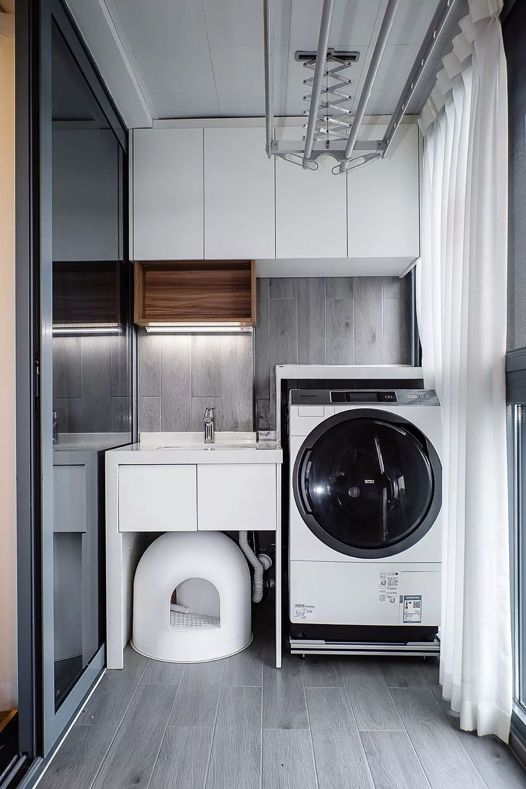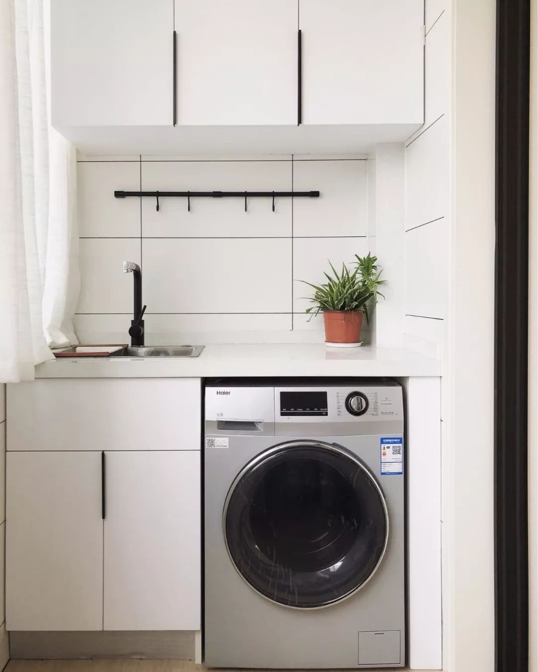 陽臺的洗衣機(jī)柜+洗衣池的基礎(chǔ)下,還有很多常用的洗衣液、洗衣粉、肥皂、刷子等小物品,這些物品都要有擺放的位置,并且常用的話還需要擺在隨手可得的地方,因此在洗衣機(jī)柜上下方裝開放的收納架,就是非常合適的選擇了。