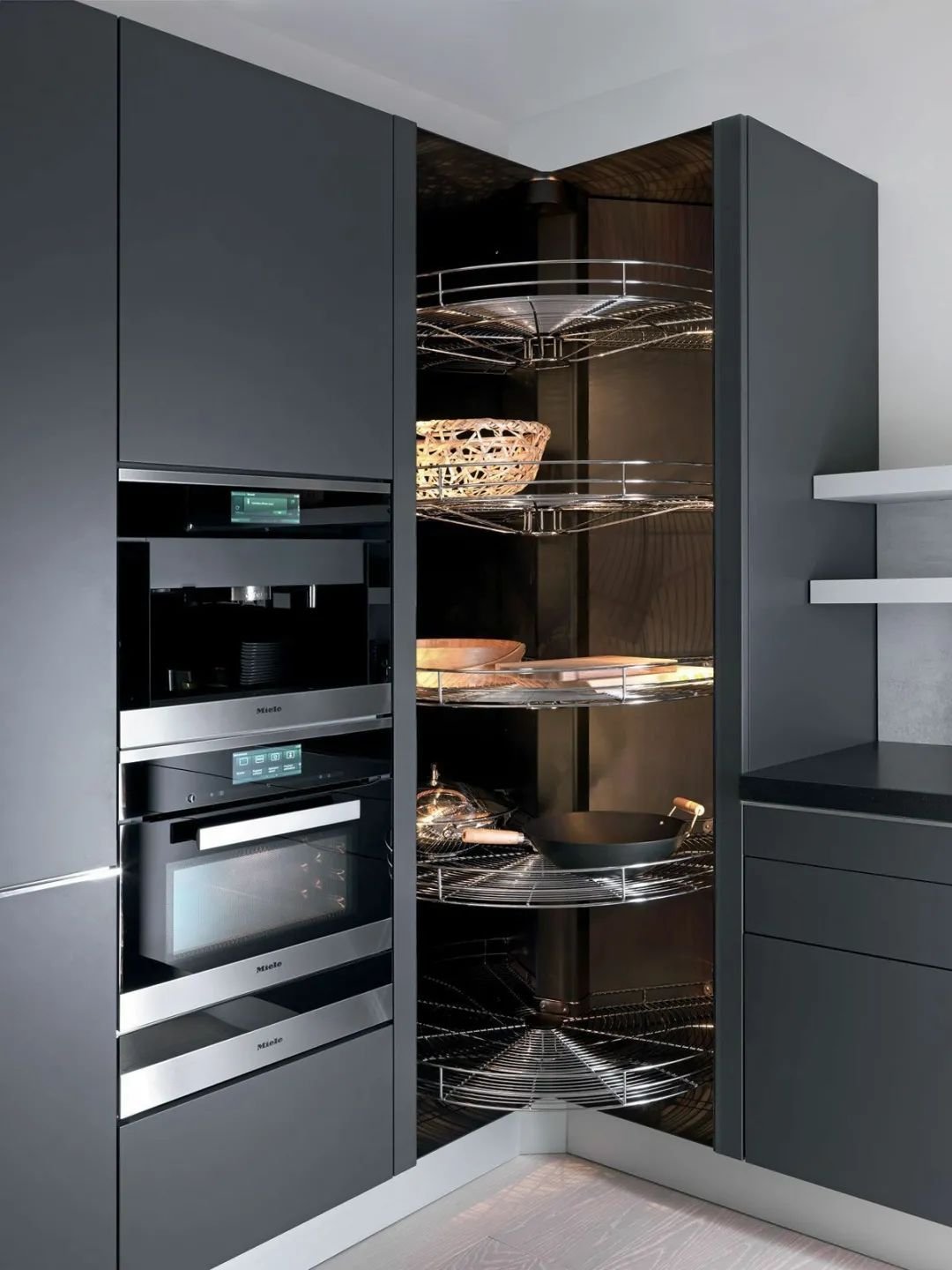 很多時(shí)候,廚房會(huì)因結(jié)構(gòu)原因難免出現(xiàn)拐彎或者轉(zhuǎn)角,柜上空間還好利用,地柜柜內(nèi)空間過深,拿取物品很不方便,轉(zhuǎn)角式設(shè)計(jì)得以很好地解決。