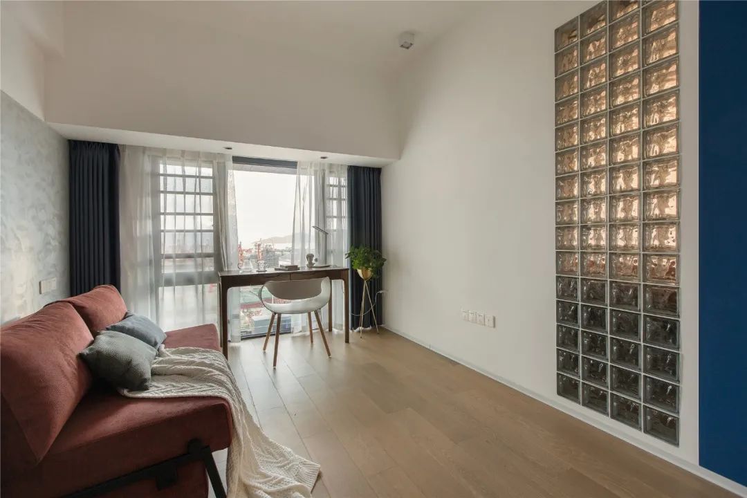 作為工作、閱讀的空間,書房對(duì)于空間的私密性的要求還是相對(duì)較低的,因此在采光條件較差的情況下,把書房的墻體換成玻璃的,還可以讓空間整體更加通透明亮。