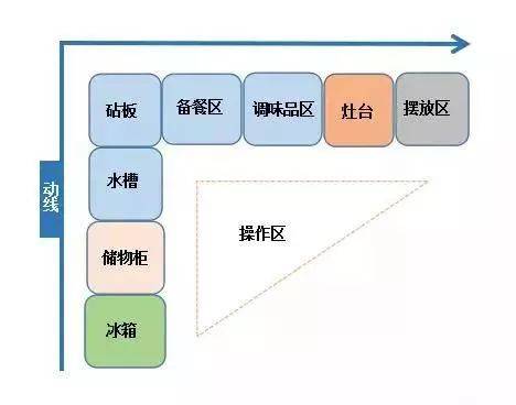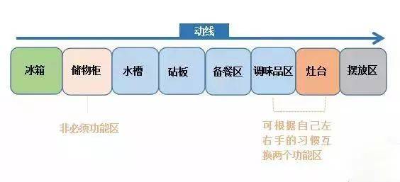 首先我們先來看一張圖,沒錯,這就是我們的做法習(xí)慣流程圖,廚房布局要保證這一系列流程的流暢性,那這樣的廚房才是滿分的。可能很多人不知道,關(guān)于廚房的功能分區(qū),我們有一個“潛規(guī)則”,那就是“一金二銀區(qū)域”。