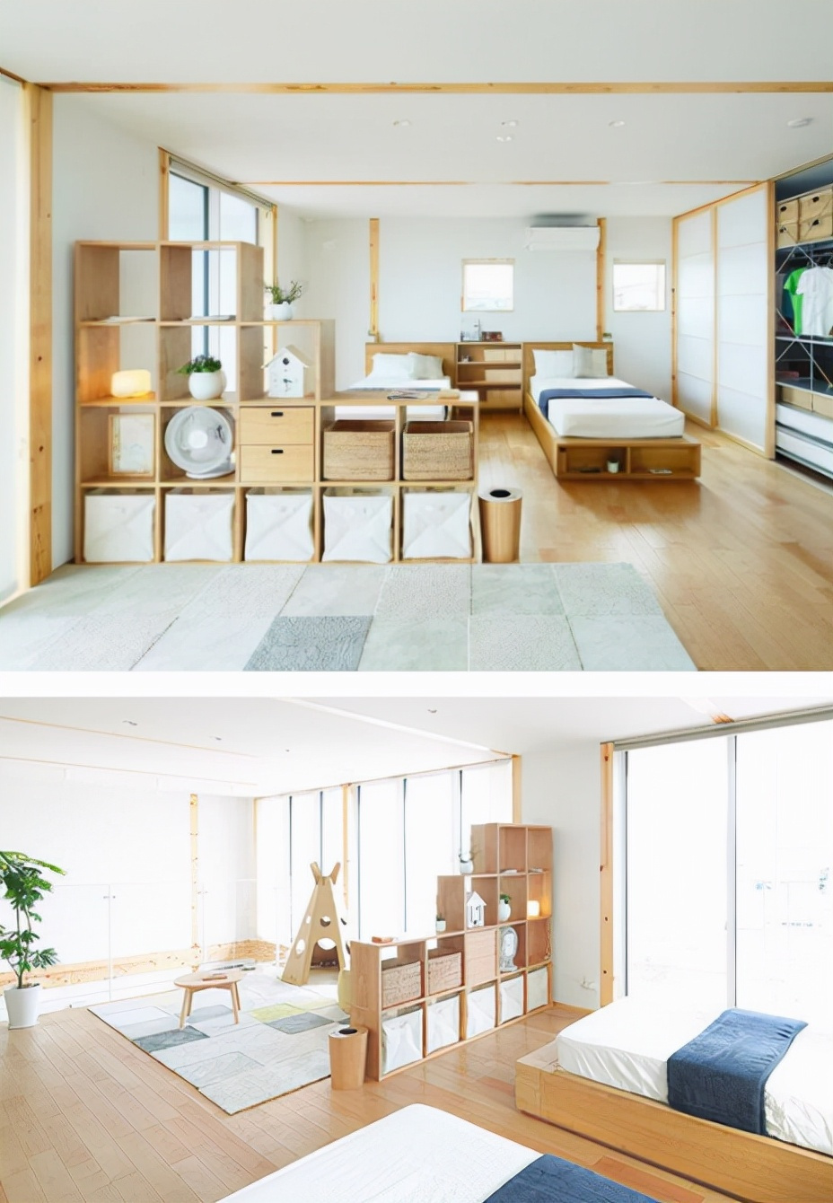 當(dāng)然也可以將玻璃移門換成其他的隔斷,就例如下方的置物架作為隔斷,來(lái)為臥室實(shí)現(xiàn)“三分離”的設(shè)計(jì)。