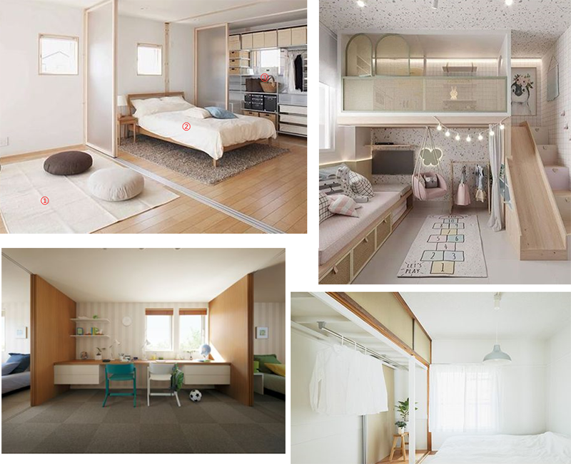 將兩間小臥室打通,實(shí)現(xiàn)空間整合,這時(shí)候家里有一男一女兩個(gè)孩子的,可以利用兩扇移門將空間劃分開(kāi),實(shí)現(xiàn)一人一個(gè)單間。這里的隱私性也有了,空間也獨(dú)立,當(dāng)然還能多出中間一部分的空間,用來(lái)擺放書(shū)桌給孩子打造一個(gè)雙人學(xué)習(xí)位,提供一個(gè)功能雙全且寬敞的生活環(huán)境。