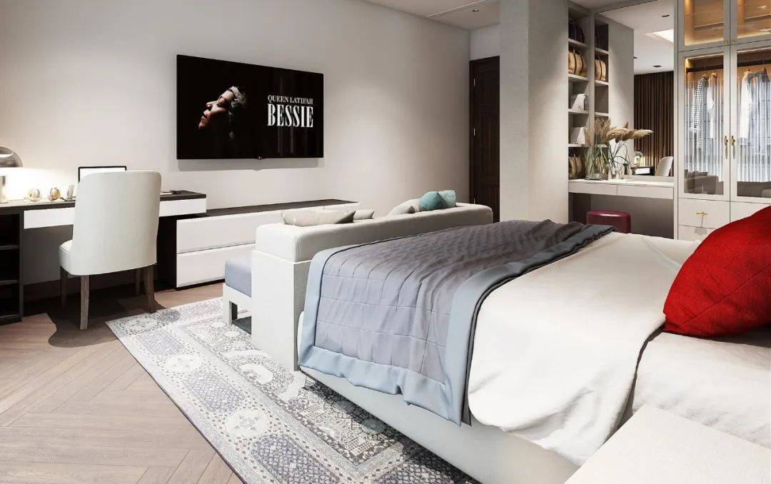 投影儀可以投影在白墻或白色柜門上,而電動(dòng)幕布安裝也可以隱藏在天花上方,對(duì)床尾空間的布置利用不會(huì)有太大的影響,如果臥室空間有限,也可以考慮用投影儀的方案。
