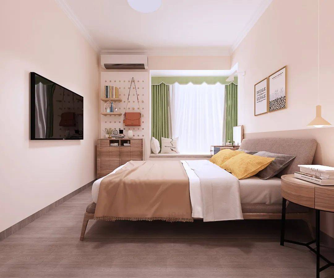 同樣是床尾沒(méi)裝衣柜的臥室,如果床尾擺不下斗柜的話,也可以采取壁掛安裝電視機(jī)的方式,在有限的臥室空間實(shí)現(xiàn)電視機(jī)的功能?,F(xiàn)在的電視機(jī)都很薄,壁掛安裝的話,不會(huì)占用多少空間,適合面積較小的臥室戶型。