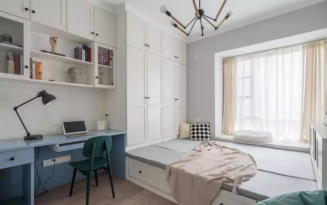 2)飄窗變床頭柜,飄窗不能移動(dòng),可家具卻可以隨意擺放。把床緊挨著飄窗而放,飄窗就變成了實(shí)用的床頭柜,放上幾本自己喜愛(ài)的書(shū),擺上一盞別致的臺(tái)燈,真是合理利用了空間。